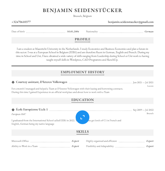 I am a student at Maastricht University in the Netherlands. I study Economics and Business Economics and plan a future in this sector. I attended a European School in Brussels (EEB1) and am therefore fluent in German, English and French. During my time in school and university, I have obtained a wide variety of skills ranging from leadership during school or university work to having taught myself skills in WordPress, CAD-Programms and SketchUp.